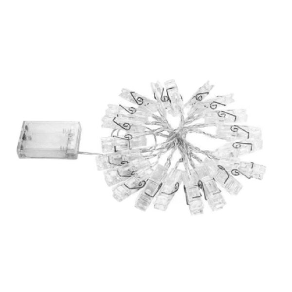 Ghirlanda Luminoasa cu 10 Clipsuri pentru Poze, Embo, 1.5 m, cu Baterii si Telecomanda, 8 Programe, Fir Argintiu, Alb Cald