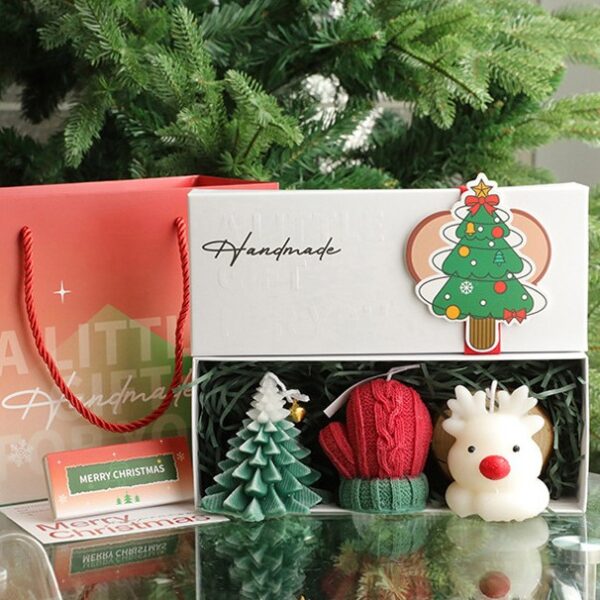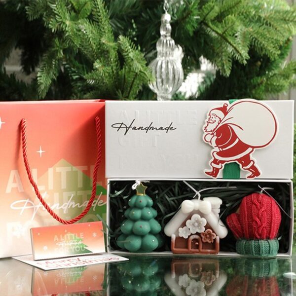Lumanari Parfumate de Craciun, Embo, GIFT BOX din 3 Lumanari din Ceara de Soia, Model B Brad, Manusa, Casuta, 22.5 x 9.5 x 5 cm, Multicolor