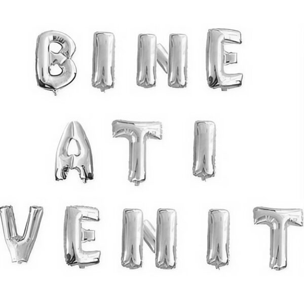 Set Baloane din Folie Metalizata, Embo, Figurine Litere, Model Bine Ati Venit, Tema Aniversare, 40 cm, Ambalaj Individual, Pai inclus, Umflare cu Aer sau Heliu, Argintiu