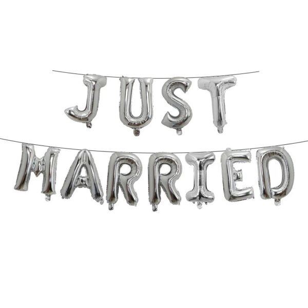 Set Baloane din Folie Metalizata, Embo, Figurine Litere, Model Just Married, Tema Nunta, 40 cm, Baloane Party, Ambalaj Individual, Pai inclus, Umflare cu Aer sau Heliu, Argintiu