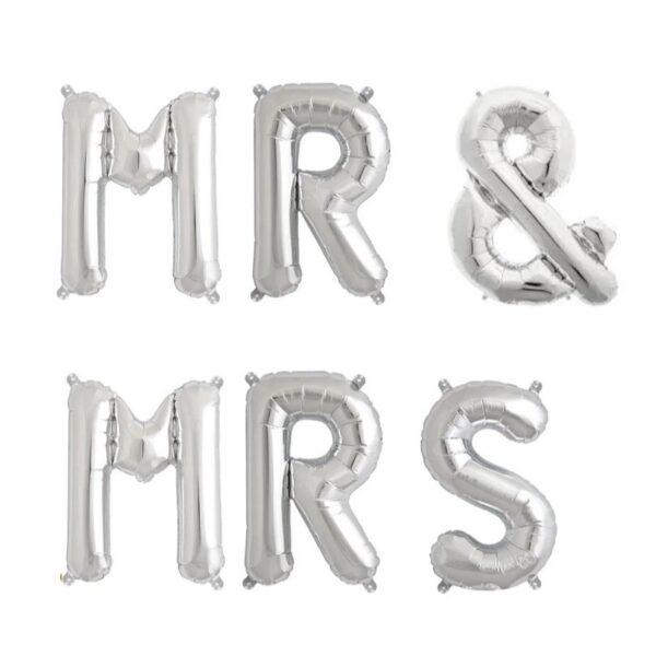 Set Baloane din Folie Metalizata, Embo, Figurine Litere, Model MR&MRS, Tema Nunta, 40 cm, Baloane Party, Ambalaj Individual, Pai inclus, Umflare cu Aer sau Heliu, Argintiu