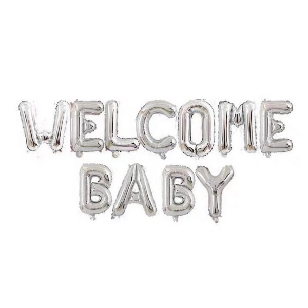 Set Baloane din Folie Metalizata, Embo, Figurine Litere, Model Welcome Baby, Tema Aniversare, 40 cm, Ambalaj Individual, Pai inclus, Umflare cu Aer sau Heliu, Argintiu