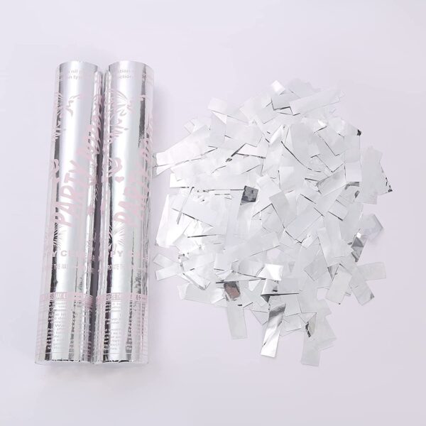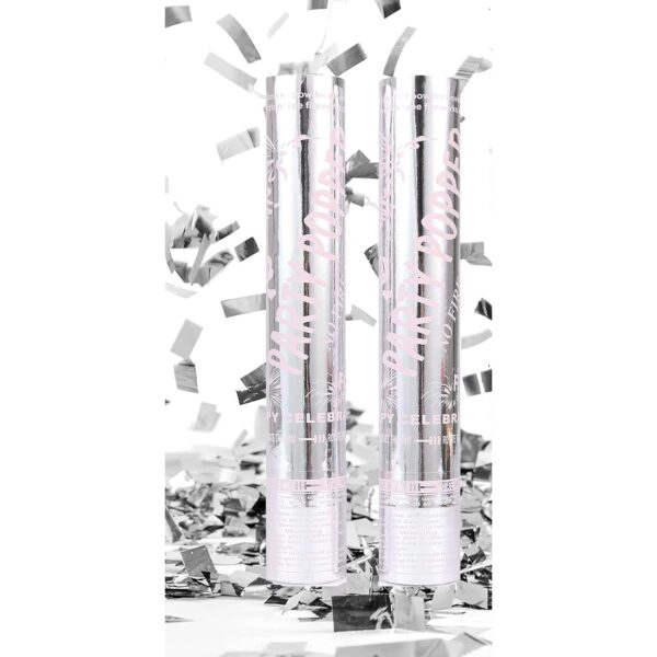 Tub de Confetti, Embo, Party Popper, 30×5 cm, Confetii Lucioase Rezistente la Foc, Eliberare prin Rasucire, Argintiu