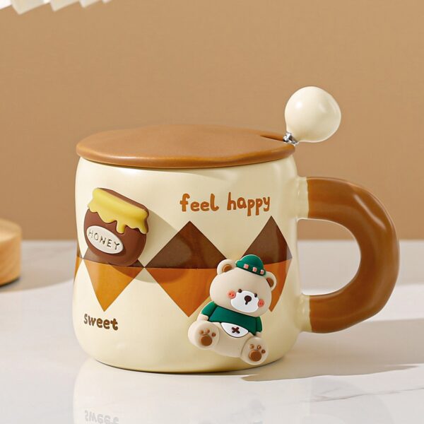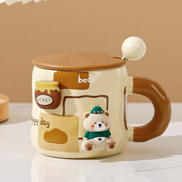 Cana din Ceramica, Embo, Model Urs pentru Baieti, Cana Universala, Cana pentru Ceai, Cana cu Lingura Metalica si Capac, 9.6 x 9.5 x 9.5 cm, 400 ml Bej