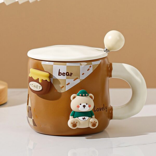 Cana din Ceramica, Embo, Model Urs pentru Baieti, Cana Universala, Cana pentru Ceai, Cana cu Lingura Metalica si Capac, 9.6 x 9.5 x 9.5 cm, 400 ml Maro