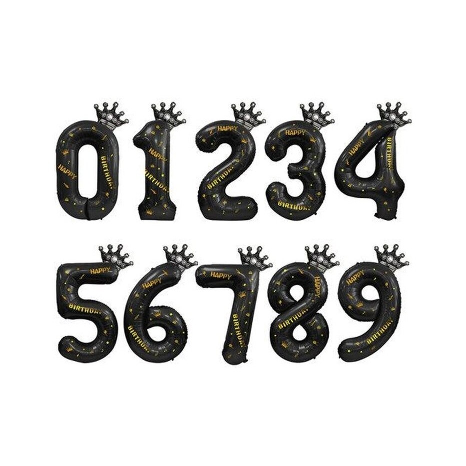 Balon din Folie Metalizata Embo, Figurina Cifra si Coroana, Scris Happy Birthday, Tema Aniversare 100 cm, Ambalaj Individual, Pai inclus, Umflare cu Aer sau Heliu, Negru, Cifra 6