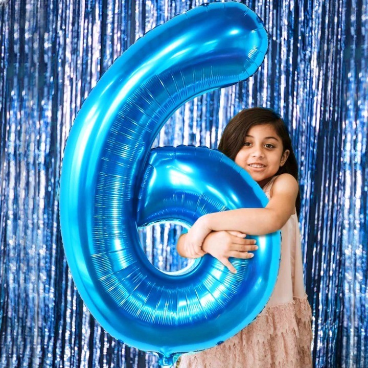 Balon din Folie Metalizata Embo, Figurina Cifra, Tema Aniversare 100 cm, Ambalaj Individual, Pai inclus, Umflare cu Aer sau Heliu, Albastru, Cifra 6