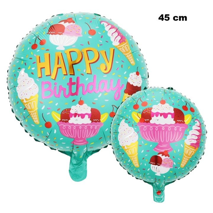 Balon din Folie Metalizata, Embo, Mini Figurina Rotunda, Model Inghetata, Happy Birthday, Tematica Aniversare, 45 cm, Ambalaj Individual, Pai Inclus, Umflare cu Aer sau Heliu, Verde