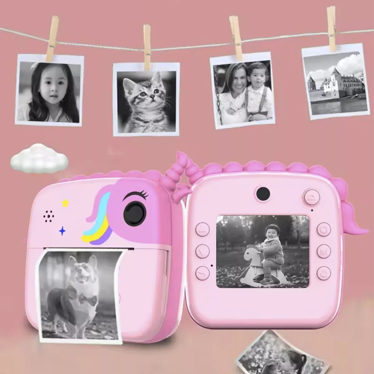 Camera Instantanee pentru Copii, Embo, Camera Frontala + Selfie, cu Functie de Printare, Cablu USB-C, Bluetooth, Compatibil iOS/Android, Model Unicorn, Snur Inclus, Roz