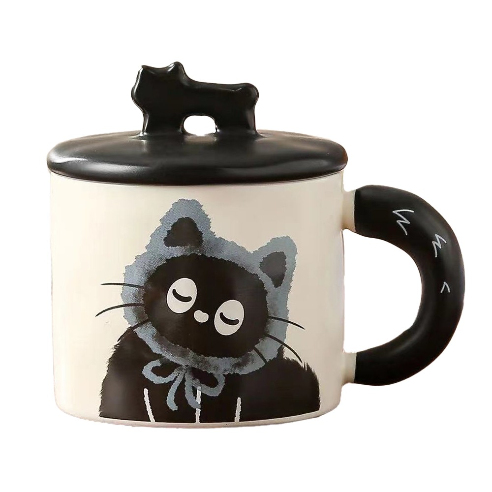 Cana din Ceramica, Embo, Model in Cutie pentru Cadou, Cana pentru Ceai, Cafea, Cana Retro Design Capac cu Figurina 3D, 9.5 x 8 x 8 cm, 360 ml, Bej, Print Pisica Albastru Negru