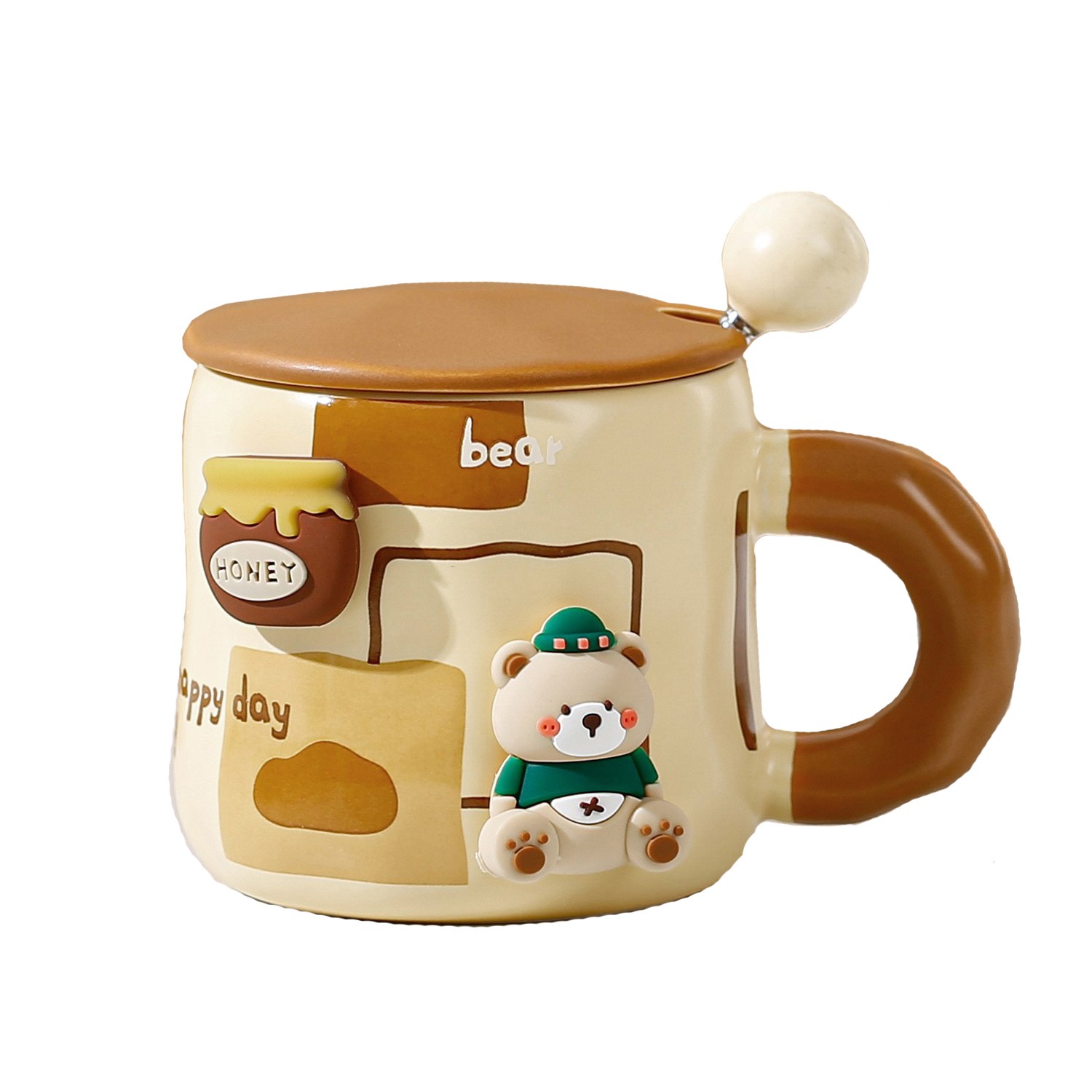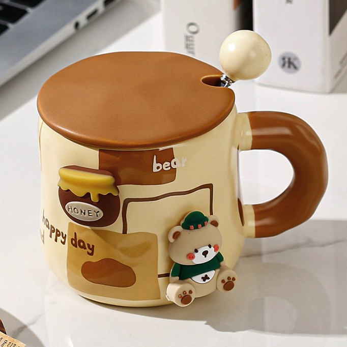 Cana din Ceramica, Embo, Model Urs pentru Baieti, Cana Universala, Cana pentru Ceai, Cana cu Lingura Metalica si Capac