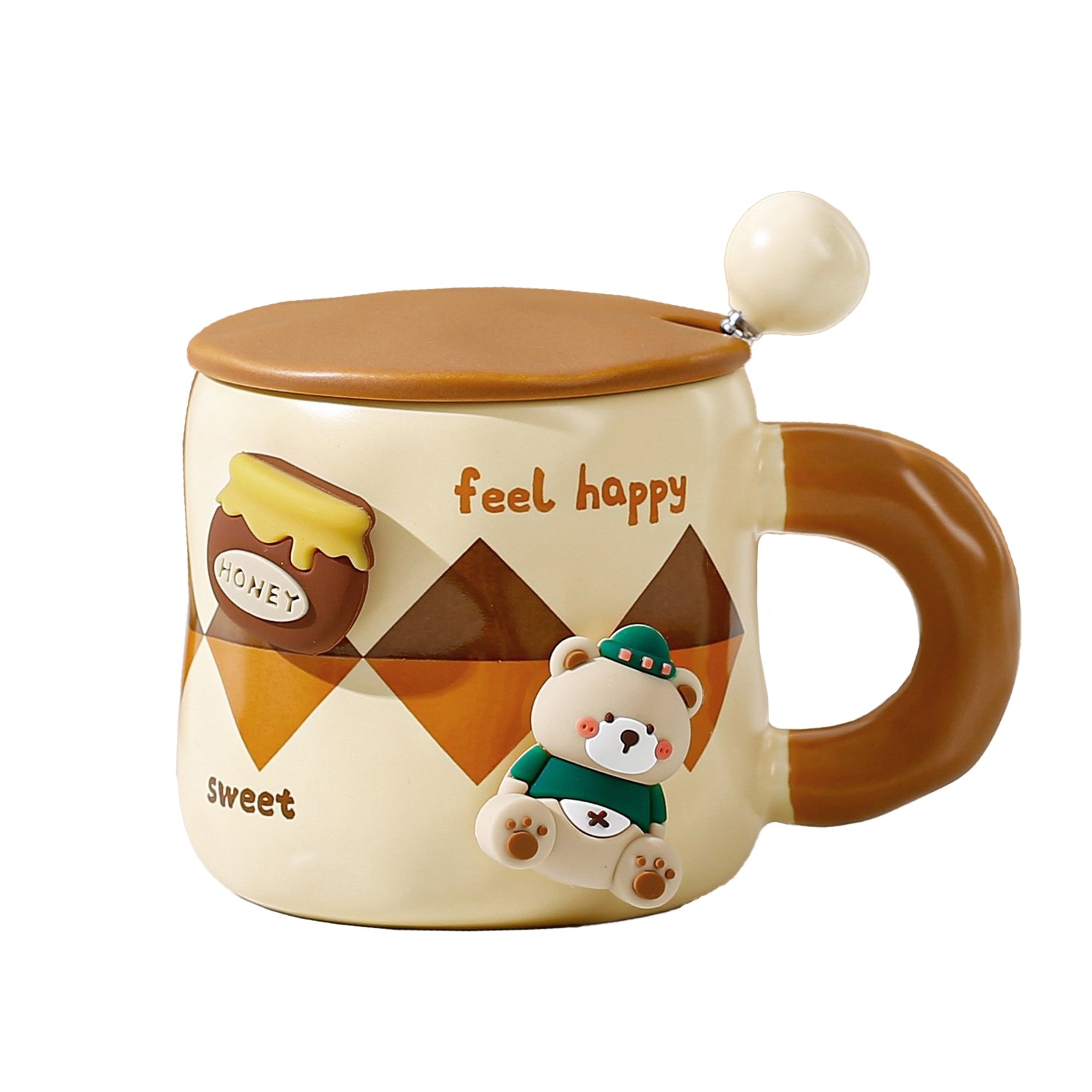 Cana din Ceramica, Embo, Model Urs pentru Baieti, Cana Universala, Cana pentru Ceai, Cana cu Lingura Metalica si Capac