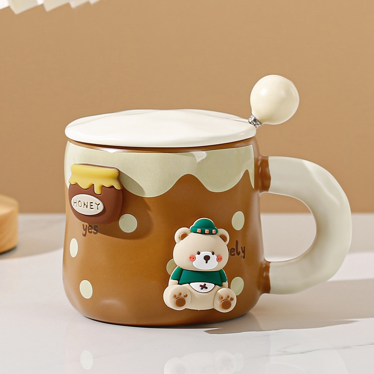 Cana din Ceramica, Embo, Model Urs pentru Baieti, Cana Universala, Cana pentru Ceai, Cana cu Lingura Metalica si Capac