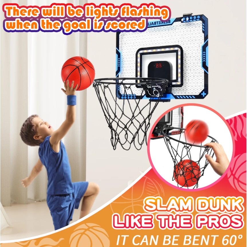 Cos de Baschet pentru Copii, Embo, cu Tablou de Bord Electronic, Minge, Pompa, 2 Moduri, Interior/Exterior, Inel Metalic si Rabatabil cu Arc, Luminos, 41x31x5 cm, Multicolor