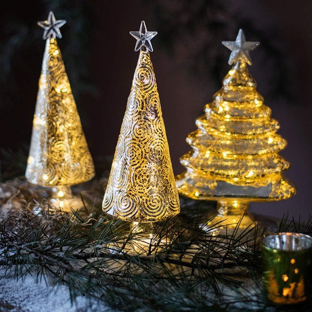 Decoratiune de Craciun, Embo, Model Brad cu Stea, din Sticla, Lumini, Baterii 3 AA, 22 x 9 cm, Auriu