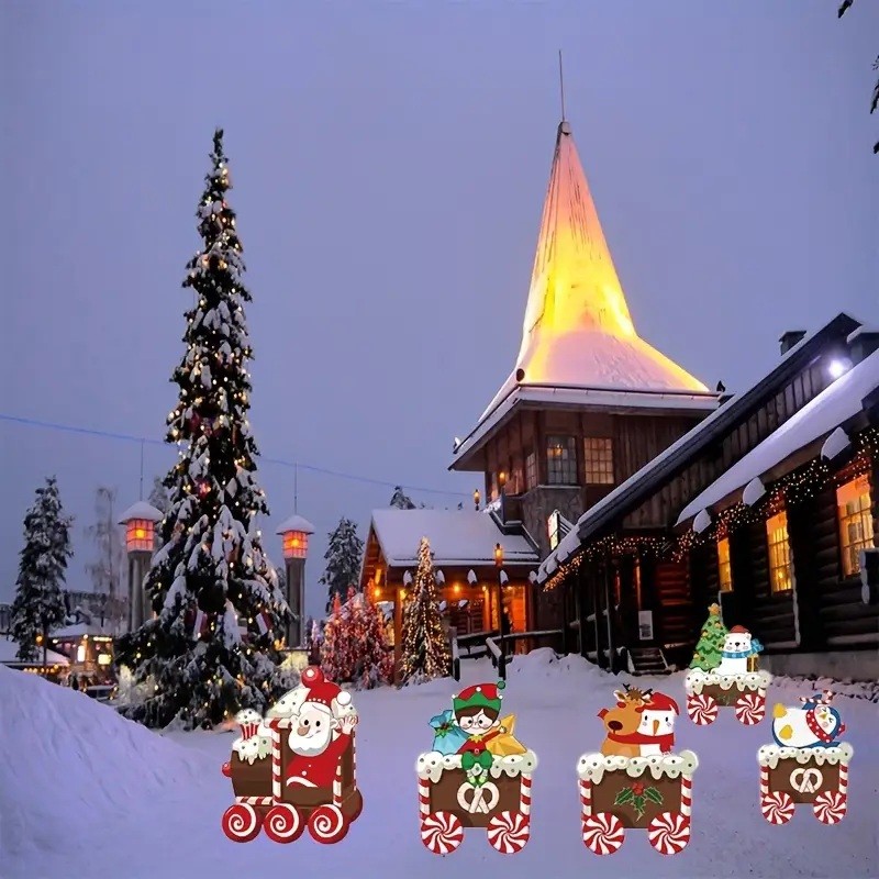 Decoratiune de Craciun, Embo, pentru Gradina, Tip Trenulet, 5 Figurine + Bete de Infipt in Pamant, din Plastic, Impermeabil, Model Mos Craciun cu Prietenii, Multicolor