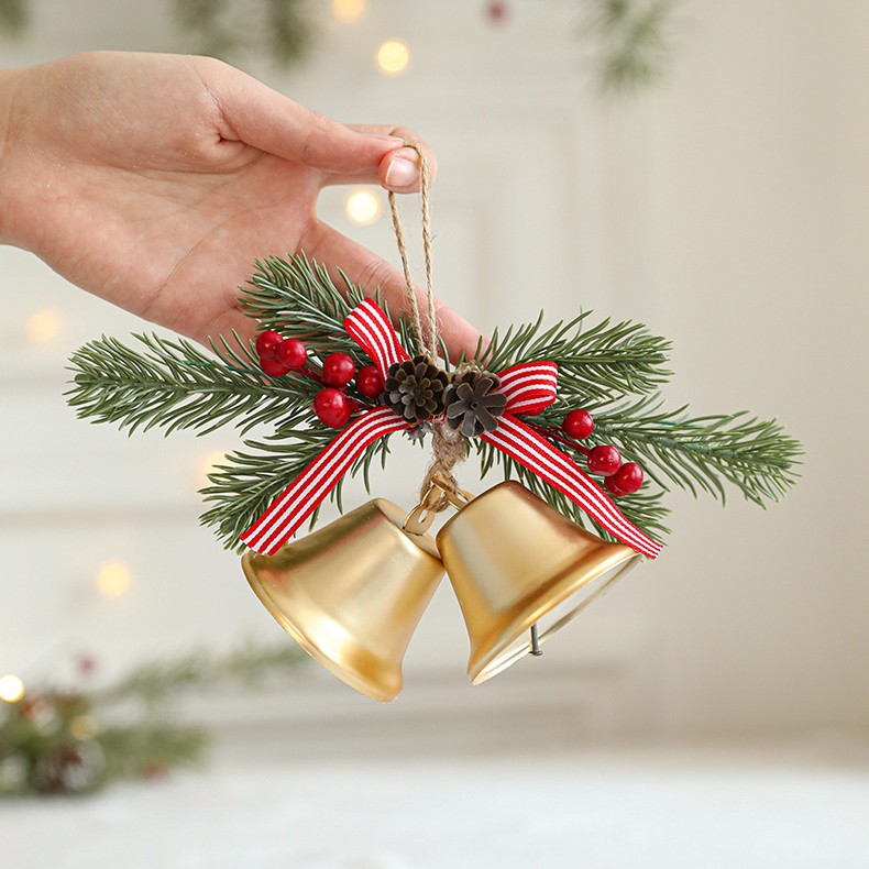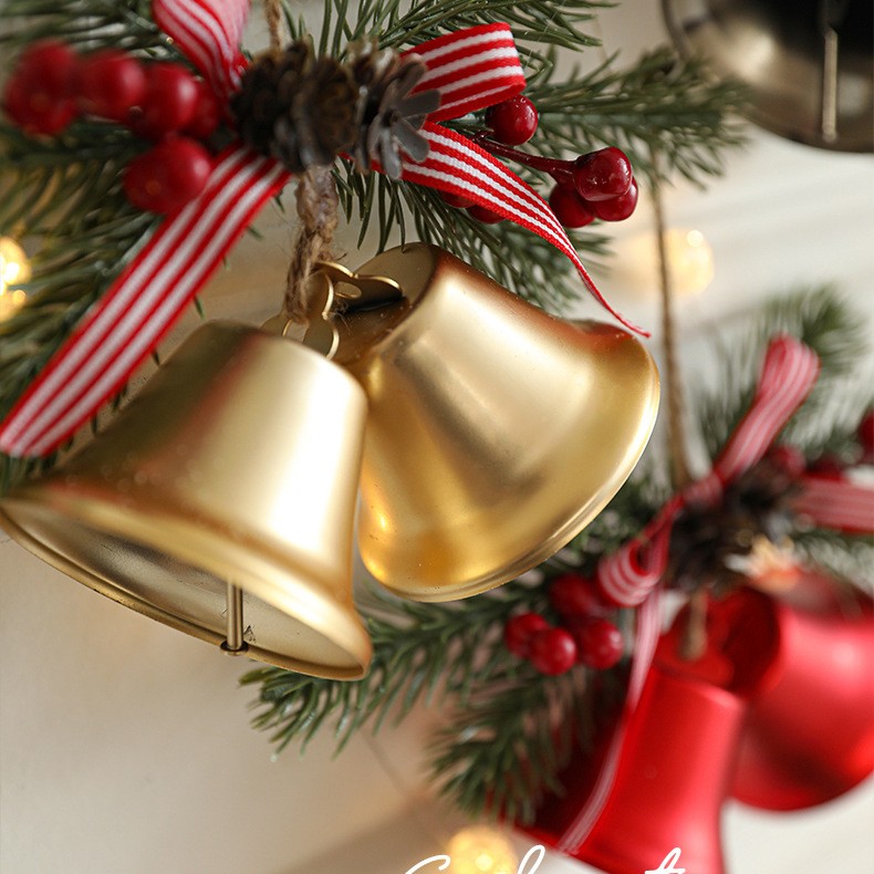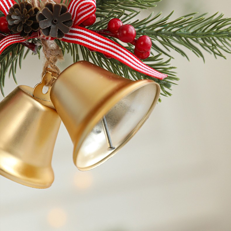 Aceasta decoratiune este realizata din materiale de calitate, cu un design rafinat ce include 2 clopotei aurii de Craciun, completati de o crenguta de brad artificiala, conuri si bobite decorative. Fundita textila adauga un accent clasic si elegant, transformand aceasta piesa intr-un element decorativ deosebit pentru brad, usi, ferestre sau orice colt al casei.
