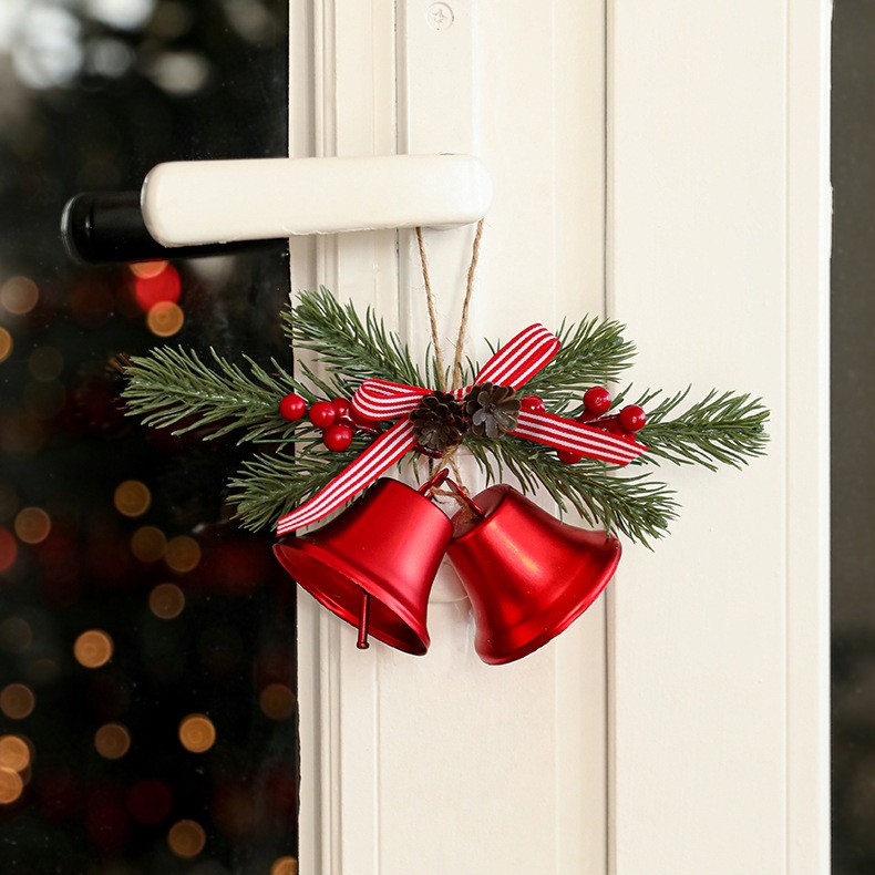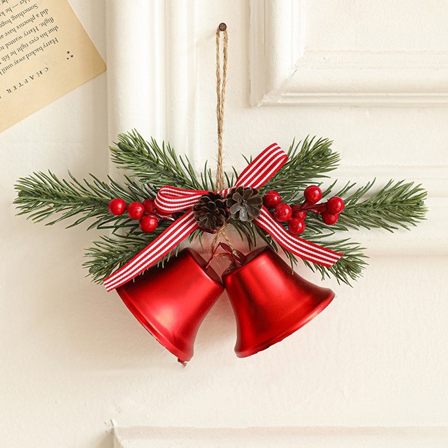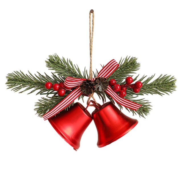 Aceasta decoratiune este realizata din materiale de calitate, cu un design rafinat ce include 2 clopotei aurii de Craciun, completati de o crenguta de brad artificiala, conuri si bobite decorative. Fundita textila adauga un accent clasic si elegant, transformand aceasta piesa intr-un element decorativ deosebit pentru brad, usi, ferestre sau orice colt al casei.