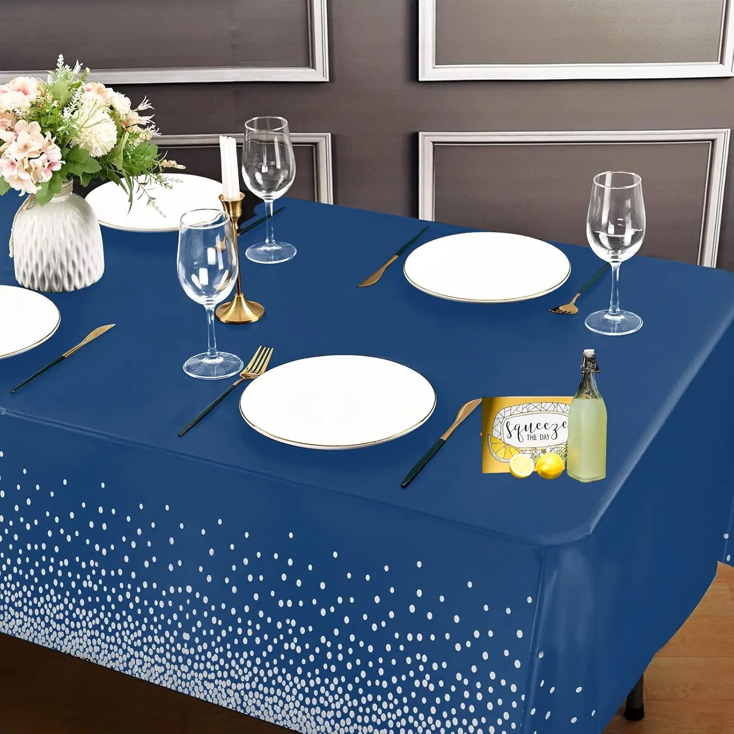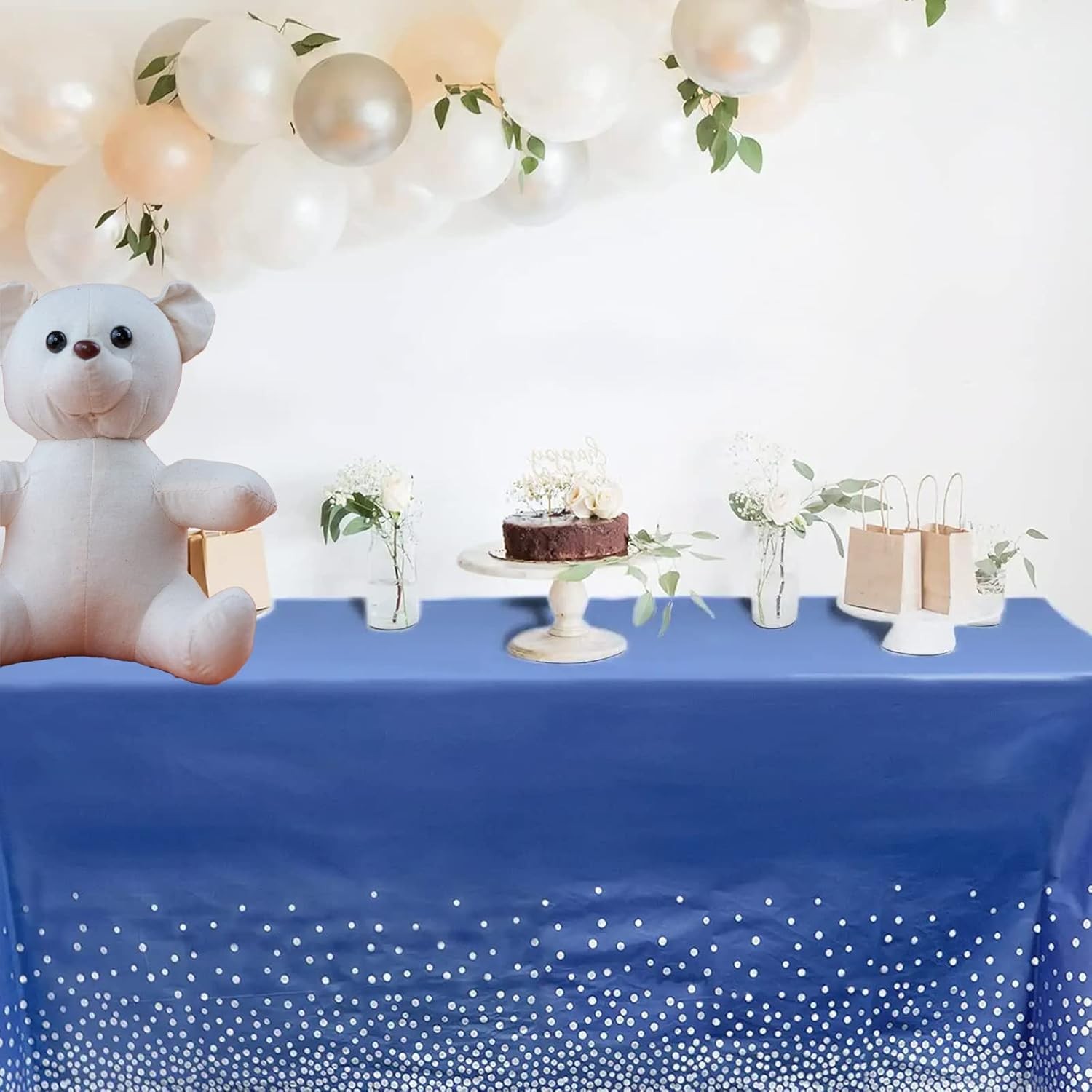 Fata de Masa, Embo, din PEVA, Imprimeu Buline Argintii, 137 x 274 cm, Impermeabila, Fara Pete, Curatare Rapida, Albastru Inchis