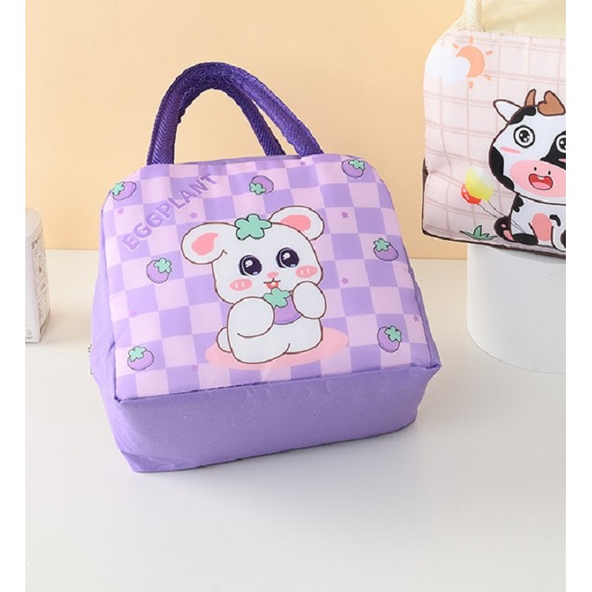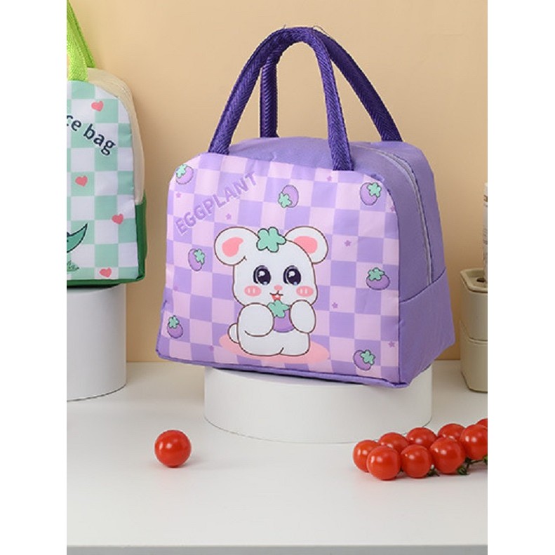 Geanta Termoizolanta pentru Copii, Embo, 23x13x19 cm, Model Imprimeu Iepuras, din Folie de Aluminiu si Panza Oxford, Mov