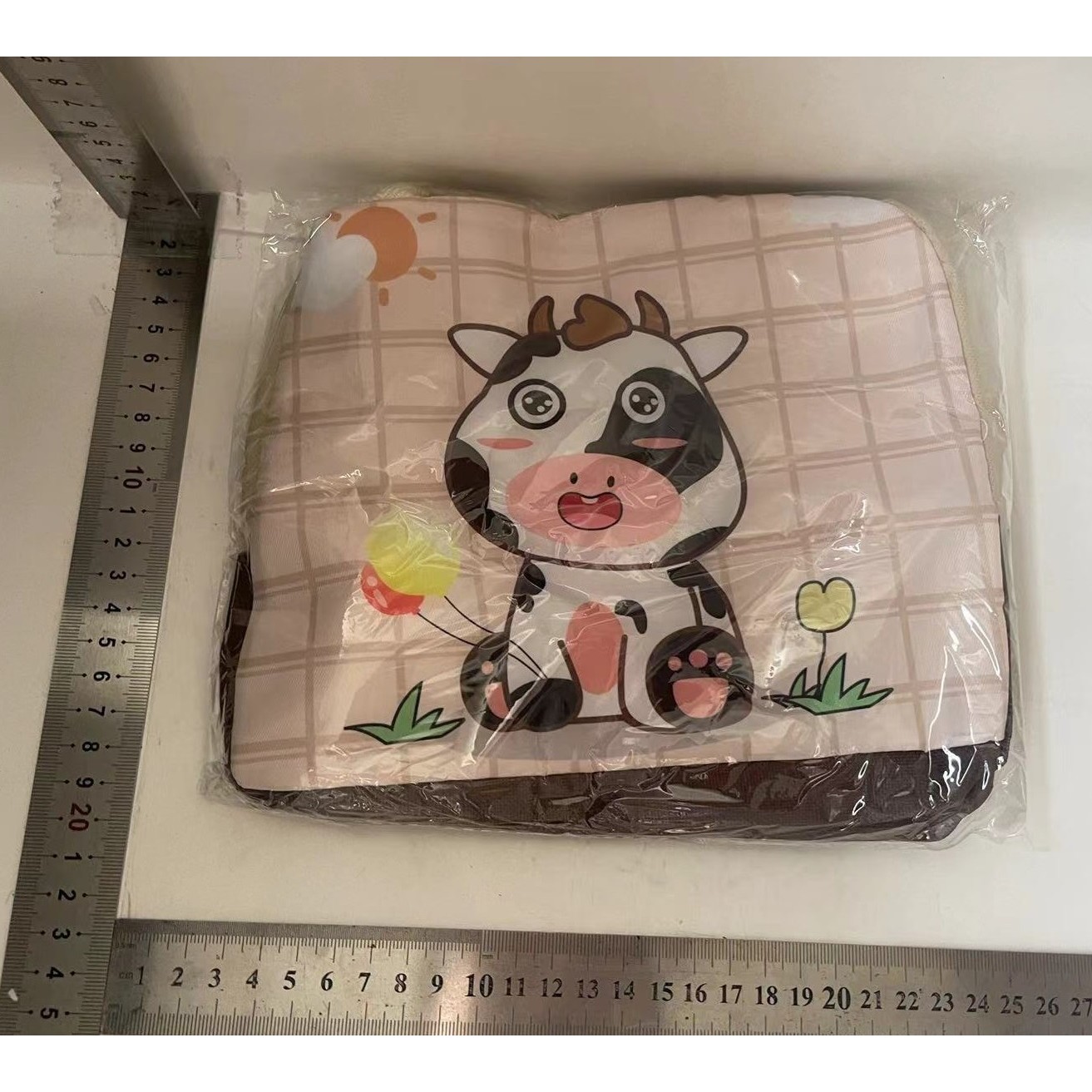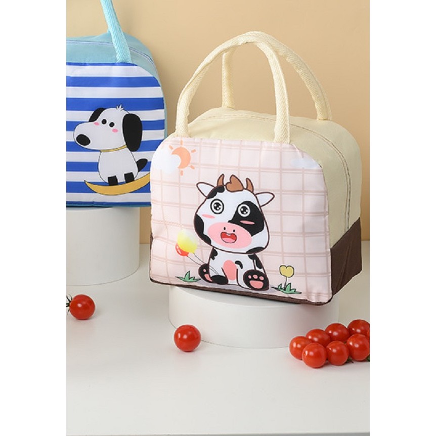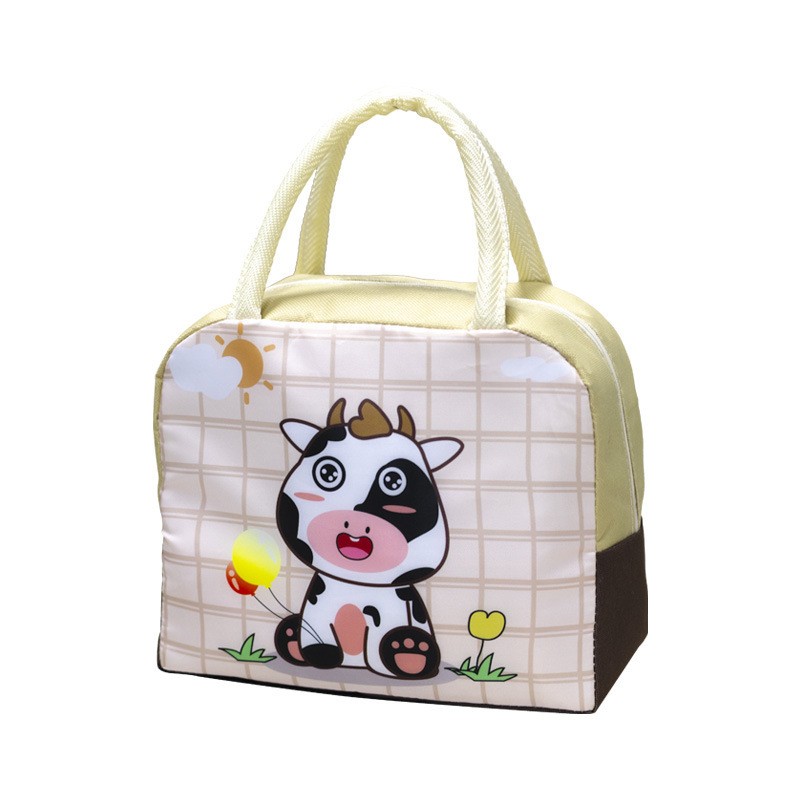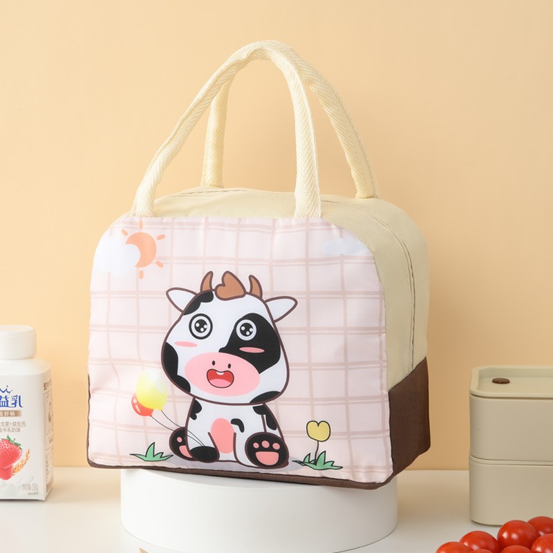 Geanta Termoizolanta pentru Copii, Embo, 23x13x19 cm, Model Imprimeu Vacuta, din Folie de Aluminiu si Panza Oxford, Bej