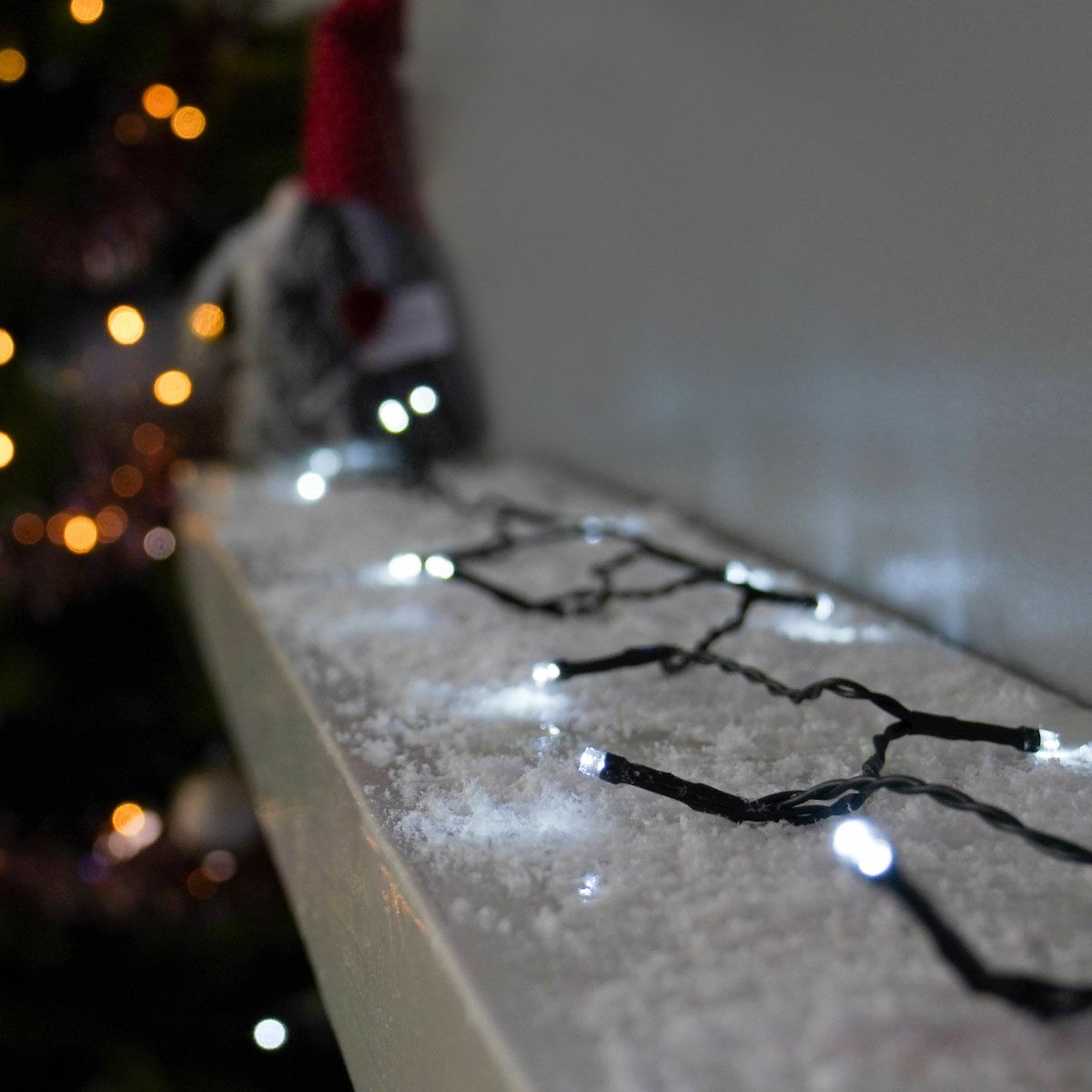 Instalatie de Craciun liniara Yoto, 10 m, din care 1 m cablu priza 220V, 100 LED, 8 jocuri de lumini, controler, fir negru, alb rece