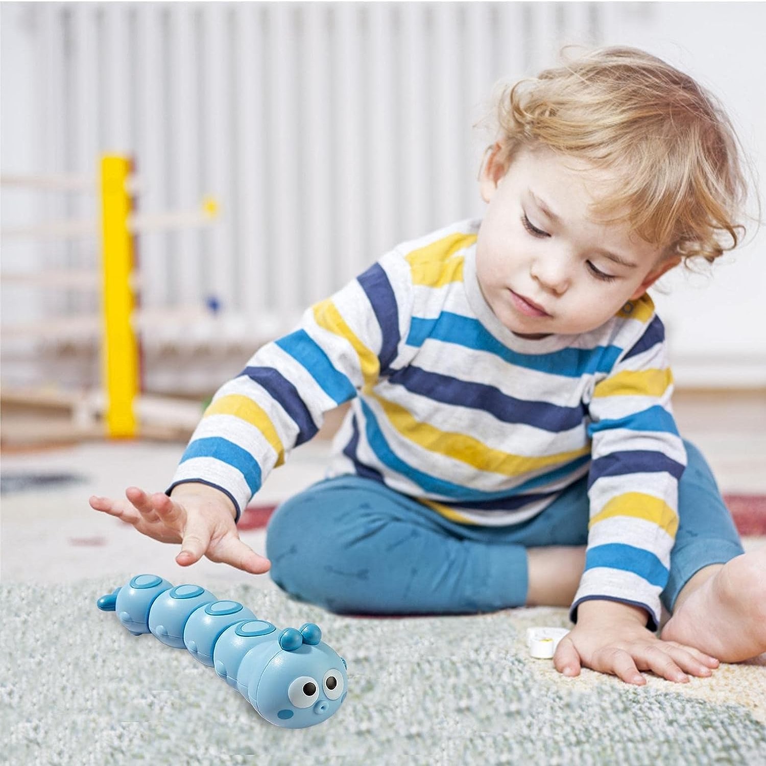 Distracție și stimulare vizuală: Jucăria “Embo” este proiectată într-o formă de omidă haioasă, cu nuanțe vesele de albastru, ceea ce o face extrem de atrăgătoare pentru copii. În timp ce omida se târăște și se mișcă pe suprafața plană, copiii vor fi captivați de mișcările jucause și vor urmări cu interes fiecare pas pe care îl face. Această stimulare vizuală sporește atenția și concentrarea, contribuind, totodată, la dezvoltarea capacităților lor de observație și analiză a mediului înconjurător.