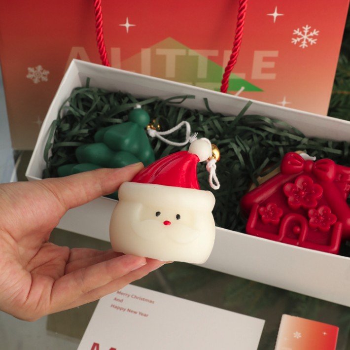 Acest gift box festiv contine trei figurine artizanale tematice de Craciun, prezentate elegant intr-o cutie alba cu umplutura verde decorativa. Produsele sunt realizate manual, cel mai probabil din ceara parfumata sau sapun decorativ turnat.