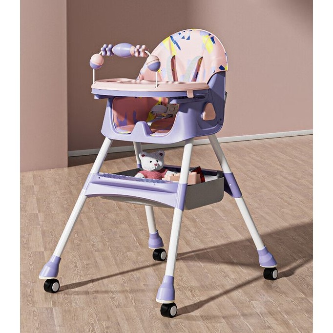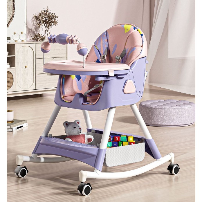 Scaun de Masa pe Roti pentru Copii, Embo, 2 Tavite si Husa Detasabile, Multifuncțional, Stabil, Centura de Siguranta, Spatar Reglabil Moale, Balansoar, Cos de Depozitare, de la 6 Luni, Mov