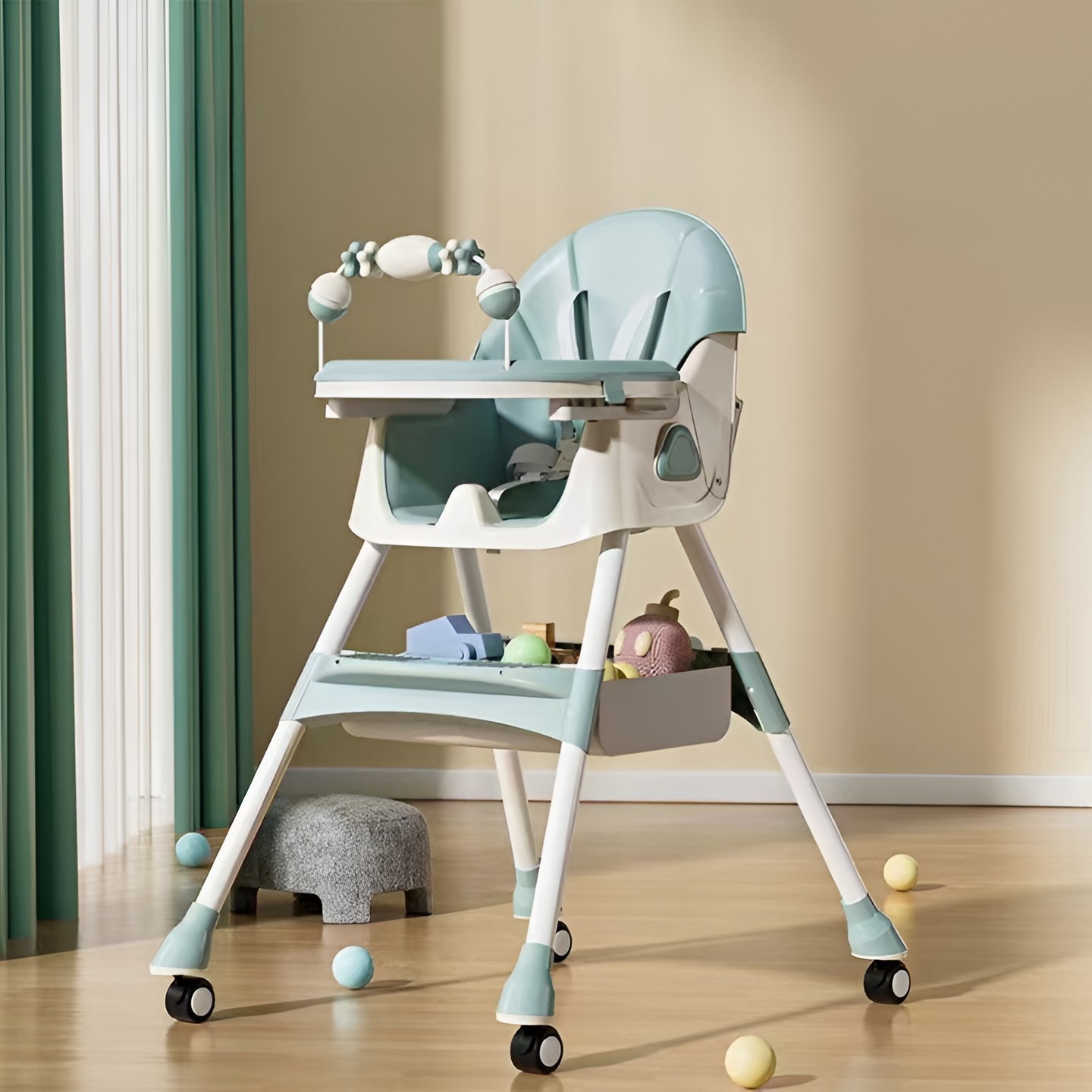 Scaun de Masa pe Roti pentru Copii, Embo, 2 Tavite si Husa Detasabile, Multifuncțional, Stabil, Centura de Siguranta, Spatar Reglabil Moale, Balansoar, Cos de Depozitare, de la 6 Luni, Verde