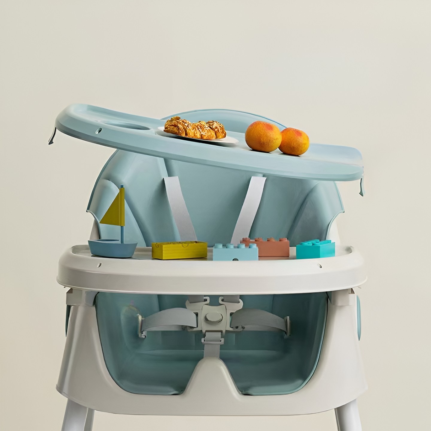- Compartimentul de depozitare si cele două farfurii sunt detașabile și ușor de curățat: Scaunul vine cu o tavă dublă detașabilă, cu mai multe niveluri, realizată din material alimentar. O tavă canelată în partea de sus pentru sticle sau tacâmuri și o tavă în partea de jos pentru jucării. În coșul de depozitare puteți plasa obiectele ale bebelușului. Tava și coșul de depozitare sunt detașabile și ușor de curățat.
