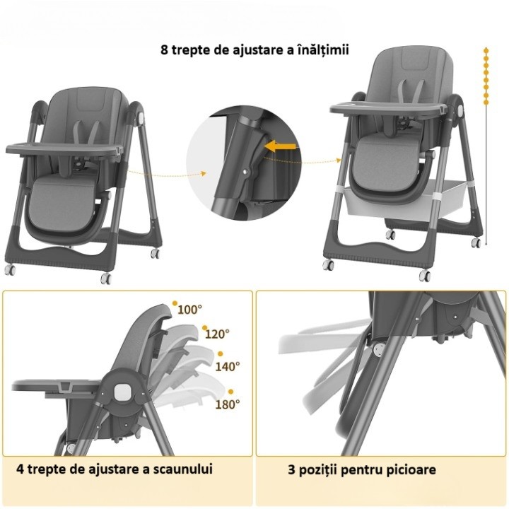 -Scaunul pentru copii cu 8 trepte ale înălțimii, 2 tăvi pentru farfurii retractabile.