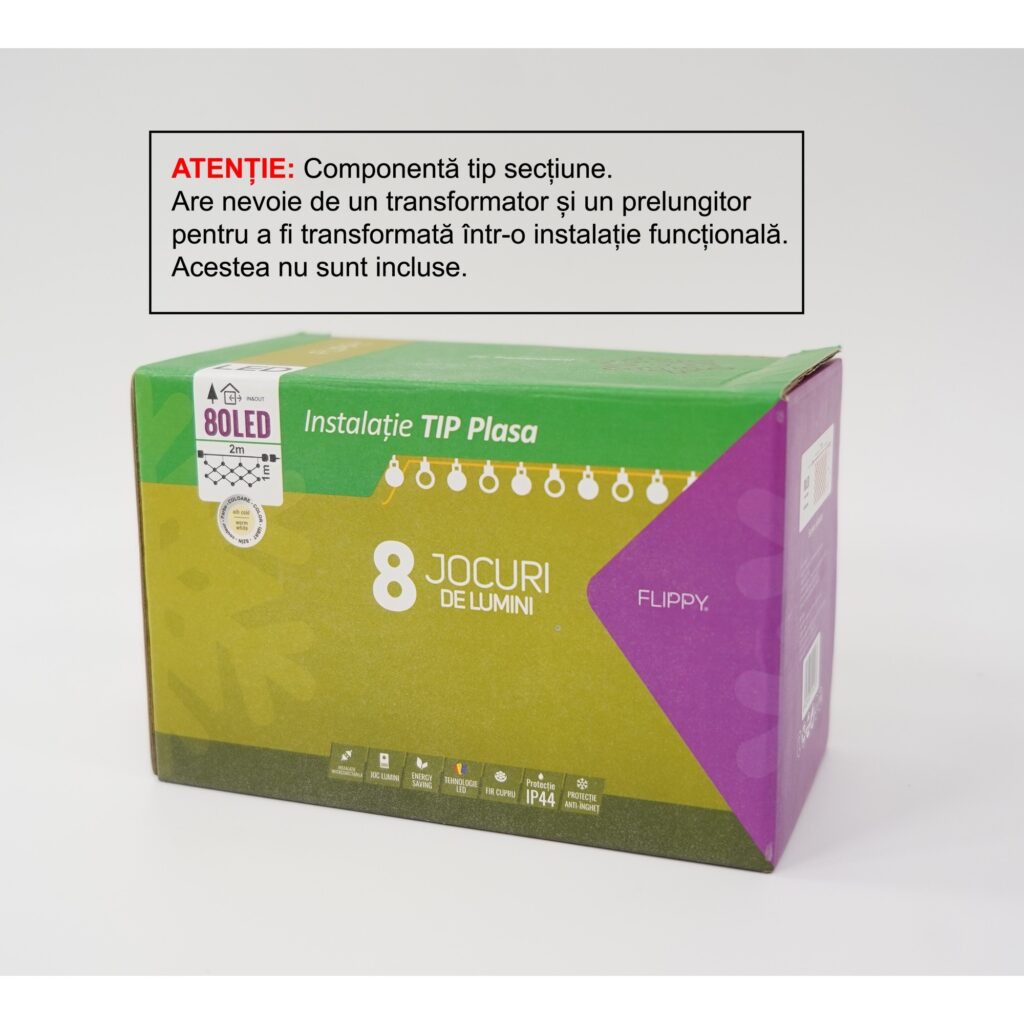 Sectiune Instalatie de Craciun Embo, Tip Plasa, 80 LED-uri, 2 m x 1 m, 8 jocuri de lumini, Interconectabila, Fir transparent, Alb cald