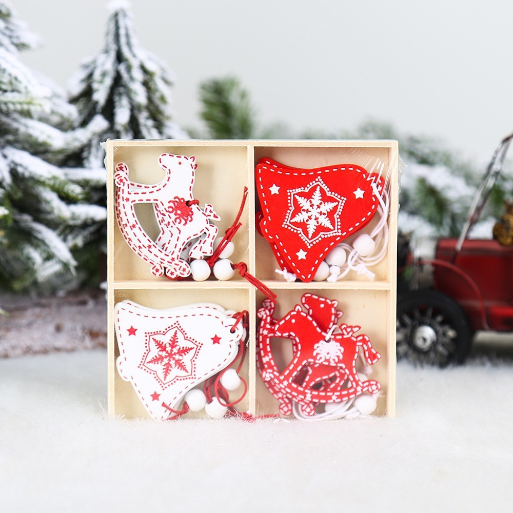 Set 12 Decoratiuni de Craciun din Lemn, Embo, cu Snur pentru Agatare in Brad, Model Caluti si Clopotei, Alb-Rosu