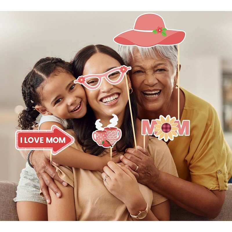 Setul de 18 accesorii pentru poze Embo este alegerea perfectă pentru a adăuga un plus de veselie și emoție la petrecerile dedicate Zilei Mamei.