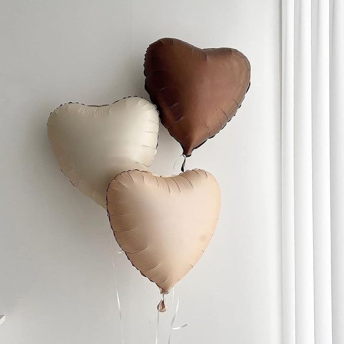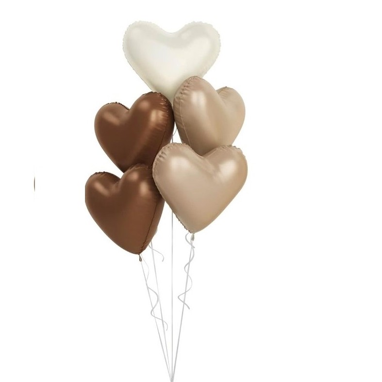 Set 3 Baloane din Folie Metalizata, Embo, Figurine Inimi, Tema Ziua Indragostitilor, 45 cm, Ambalaj Individual, Pai Inclus, Umflare cu Aer sau Heliu, Crem/Maro