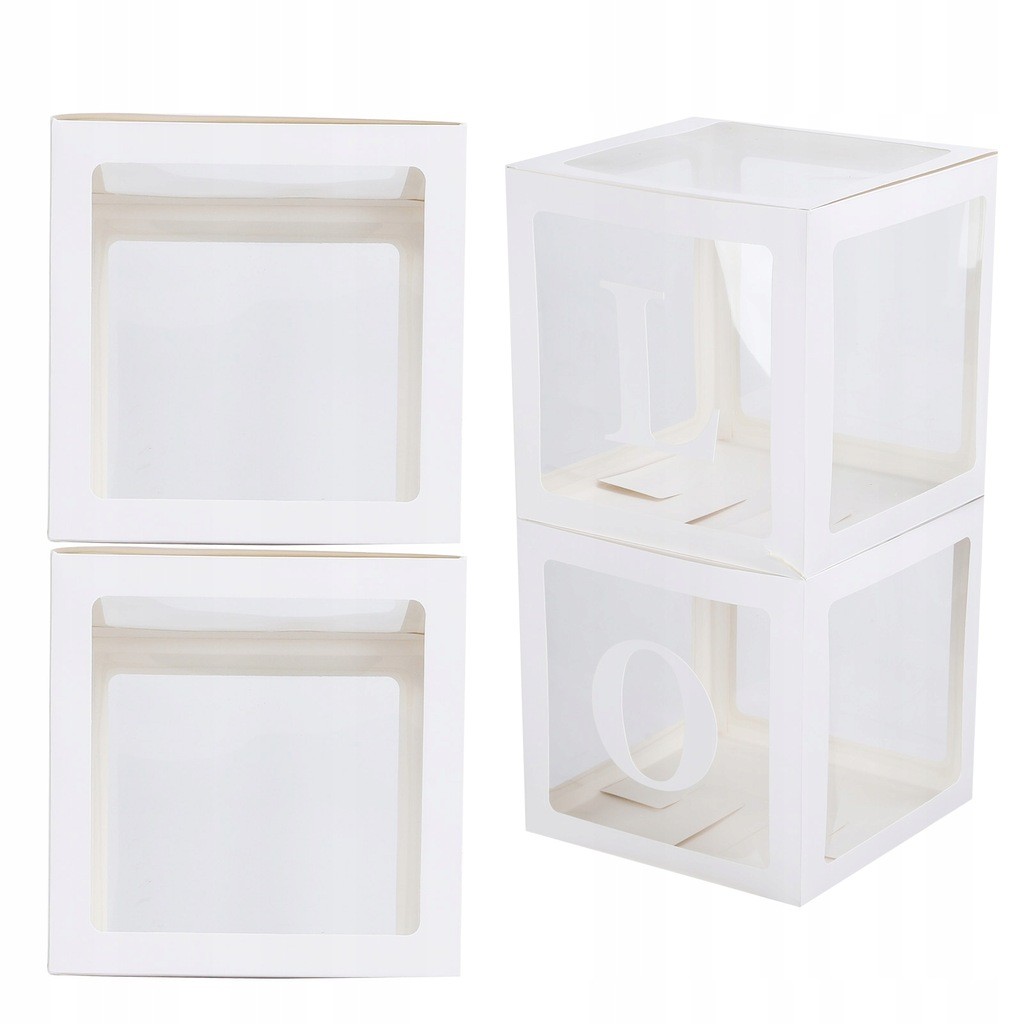 Set 4 Cutii pentru Baloane, Embo, Model Simplu, Tematica Aniversare, Cuburi Decorative din Plastic, Accesorii pentru Petrecere, 30 x30 cm, Transparente Contur Alb