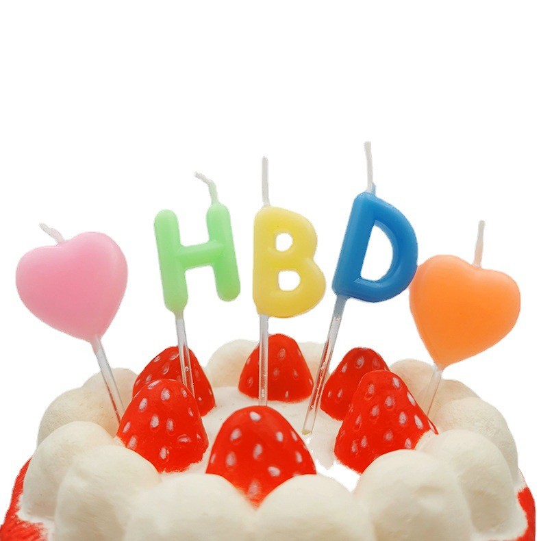 Set 5 Lumanari de Tort, Embo, Model Inimi, Litere HBD, 1.8 x 2.7 cm, din Ceara, Multicolor