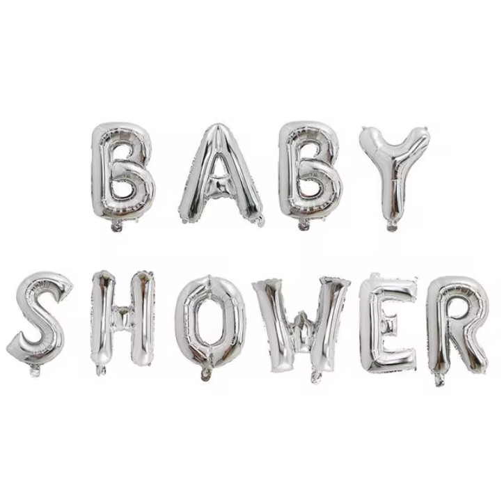 Set Baloane din Folie Metalizata, Embo, Model Baby Shower, Litere de 40 cm, Baloane Party, Ambalaj Individual, Pai, Ata si Adeziv Incluse, Umflare cu Aer sau Heliu, Argintiu