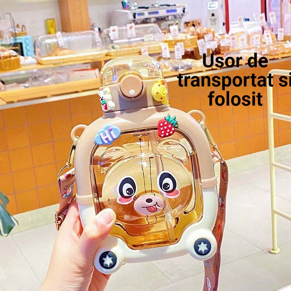 Sticla cu pai pentru copii, Embo, model ursulet, gradata, stickere aplicate, curea reglabila, din plastic rezistent la cadere, 1l, Maro, 20 x 13 cm