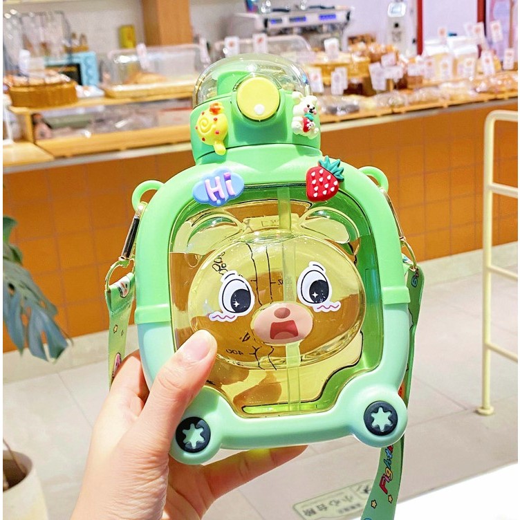 Sticla cu pai pentru copii, Embo, model ursulet, gradata, stickere aplicate, curea reglabila, din plastic rezistent la cadere, 1l, Verde, 20 x 13 cm